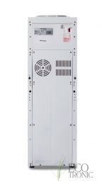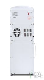 Компактный кулер для воды без охлаждения, только нагрев. С небольшим шкафчиком в нижней части. Корпус белого цвета с черной вставкой в области кранов подачи воды. Индикация режимов работы, нагрева и готовности воды. Краны «нажим кружкой».