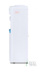 Компактный напольный кулер без охлаждения, только нагрев. Два крана подачи воды: горячей и комнатной температуры. Корпус белого цвета с голубыми вставками. Индикация режимов нагрева и готовности воды. Краны «нажим кружкой».